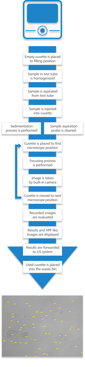 The operation theory is based on traditional manual microscopy, which is made automatic and operator independent. The instrument processes native urine samples, which are homogenized and filled into a cuvette. After sedimentation, the cuvette is moved to the microscope table, where a built-in camera captures digital images. Automatic focusing at all positions ensures well-focused images of each field of view, followed by the disposal of the used cuvette.